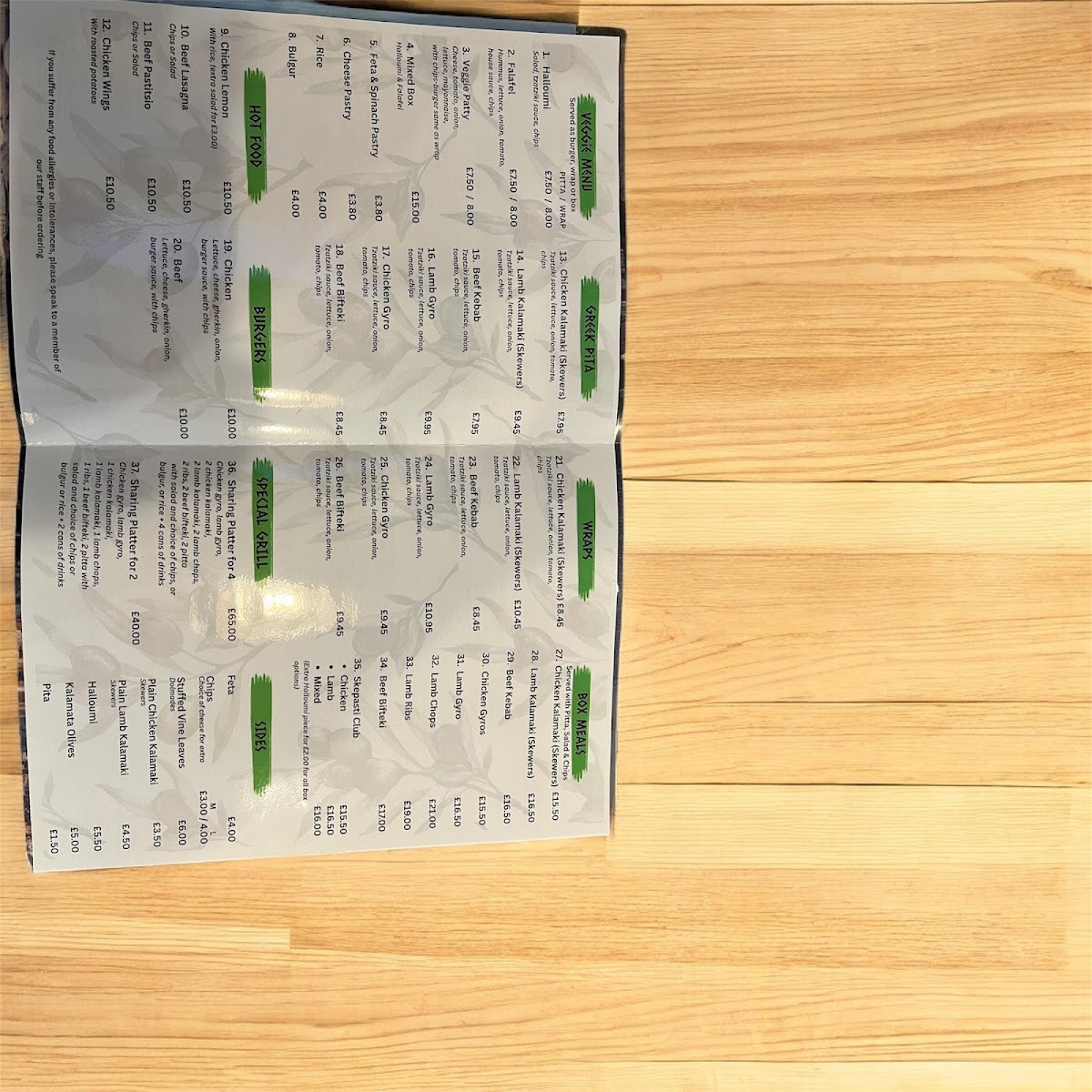 4 lamb chops, 4 lamb skewers, 4 chicken skewers, 4 Greek sausages, pitta, chips, salad and sauce
