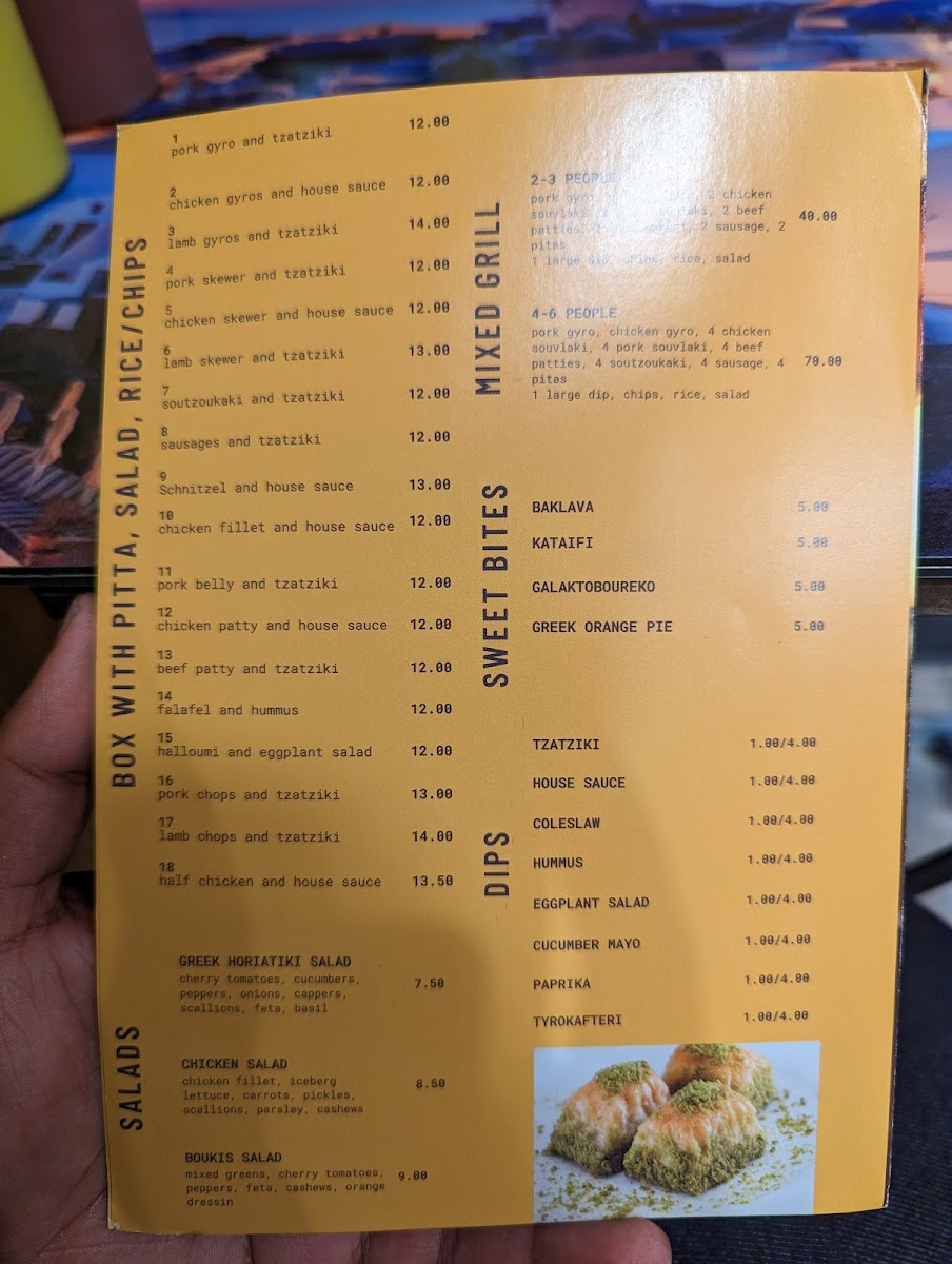 2 lamb chops, 2 lamb skewers, 2 chicken skewers, 2 Greek sausages, pitta, chips, salad and sauce or 2 cans of drinks